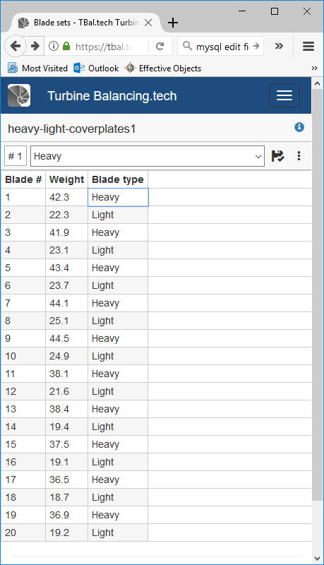 Before the plates are weighed, mark them with numbers 1 to N. When entering the weight in the table select whether the plate is a Light plate or a Heavy plate using the drop-down menu in the Type column. Weigh all plates in order of plate number. Normally all heavy plates are weighed first, and then all light plates. In the example below however, the blades are ordered with alternating heavy/light so that we can see what the unbalance might be with a random arrangement. Then we will see the improved unbalance in the results.